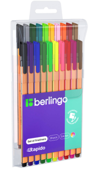 Zestaw zawiera 20 sztuk cienkopisów kapilarnych Berlingo Rapido o grubości linii 0,4 mm z trwałą i mocną końcówką pokrytą metalem zapewniającą stabilne pisanie oraz pracę z linijkami i szablonami.