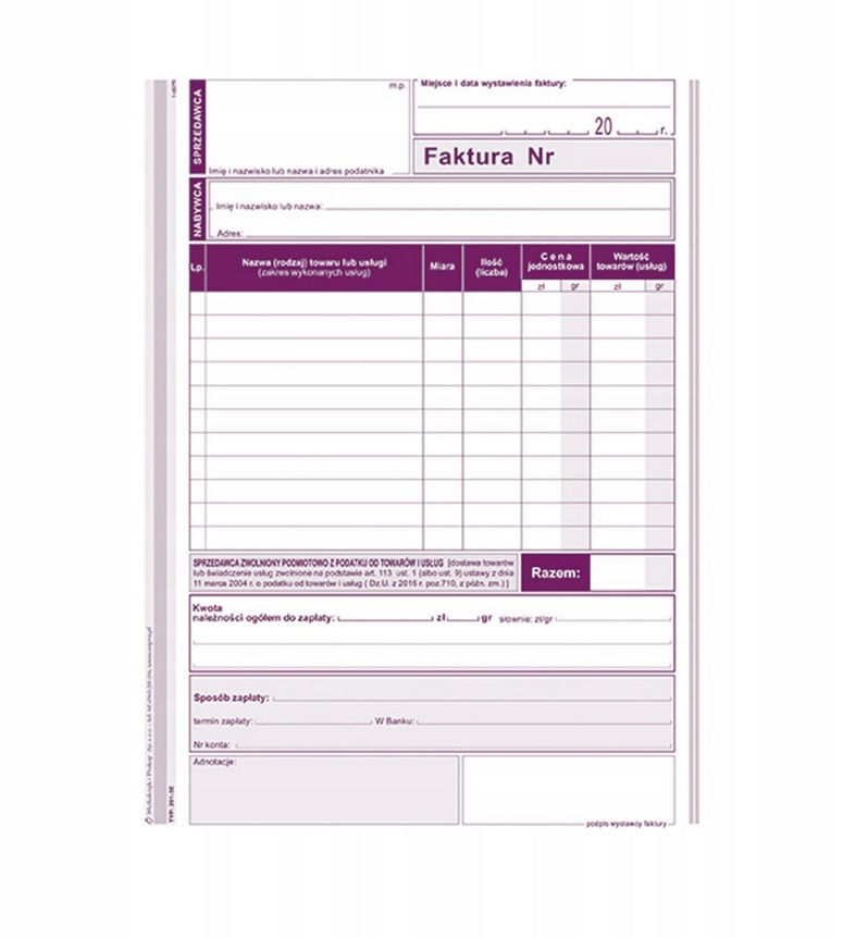Druk Faktura A5 201-3E dla podmiotów zw. z podatku