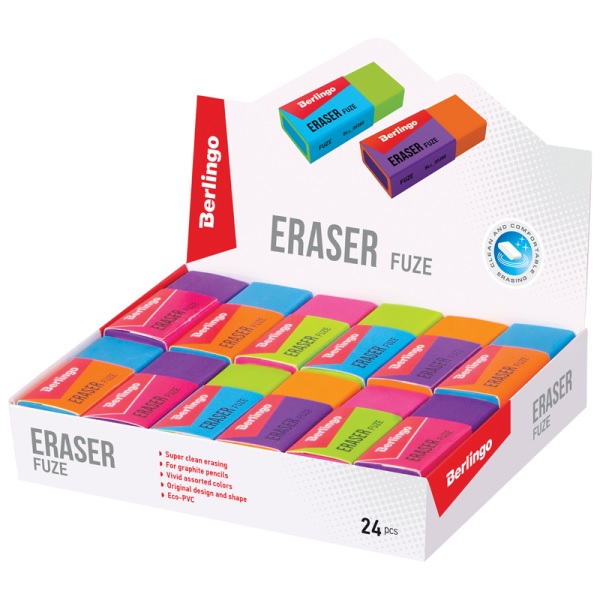 Gumki Berlingo są przyjazne środowisku, średnio miękkie. Zapewniają wystarczającą wytrzymałość, aby poradzić sobie z silnym wycieraniem śladów ołówka, jednocześnie nie niszcząc papieru. Gumka nie pozostawia smug, papier pozostaje czysty.