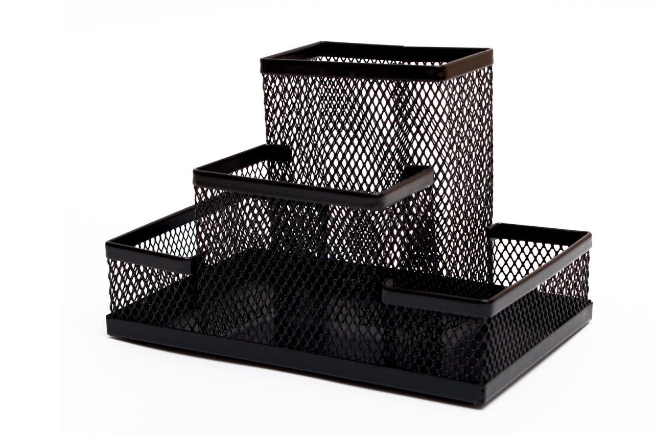 Wykonany z metalowej siatki pokrytej czarnym lakierem, łączy w sobie trwałość z eleganckim wyglądem, co sprawia, że doskonale wkomponuje się w każde biuro. Jego solidna konstrukcja gwarantuje długotrwałe użytkowanie, a estetyka przybornika przyciąga wzrok, dodając stylu każdemu biurku.