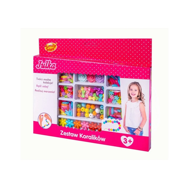 Zestaw zawiera także elastyczne żyłki, zawieszki, zapięcia i inne akcesoria, dzięki którym samodzielne projektowanie biżuterii staje się czystą przyjemnością. Świetny pomysł na prezent urodzinowy, świąteczny lub jako inspiracja do wspólnego spędzania czasu z dzieckiem.